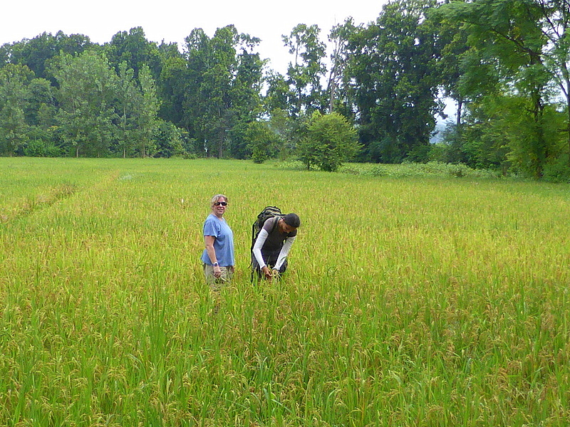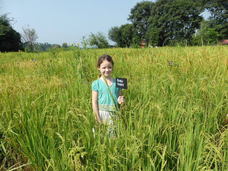 I worked in Navdanya’s rice variety polyculture field: 600 varieties of rice growing in 2 x 3 meter rectangles! I put each ant trap in a different rice variety with my trusty assistant who is helping me with this science project in lieu of school. No synthetic chemicals are used; compost generated onsite is the only fertilizer employed.
