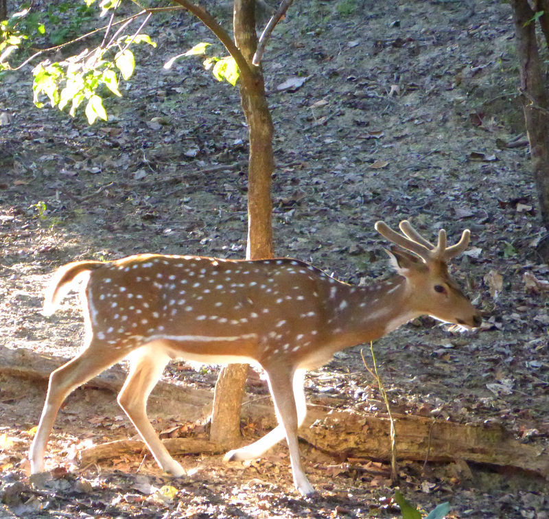 At one point during our elephant safari, the elephant began to rumble, then trumpet. The mahout whacked it with his sugar cane motivating rod, and we pressed forward toward a sambar, an almost horse-sized deer, lying in the sand not far from the river, head torn away from body. Our elephant did not wish to linger near the tiger kill so I took no photo of the dead sambar, but the sambar below is one we saw in the park, from a jeep. This female was in the process of raising her tail as an alarm flag.