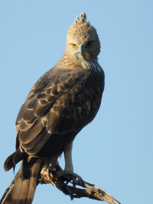 Our naturalist guides were also keenly observing the birds as tiger sentries. Birds issuing alarm calls would be a clue that could be used to spot a tiger. This crested hawk eagle had an excellent high perch on a dry riverbed in Corbett.