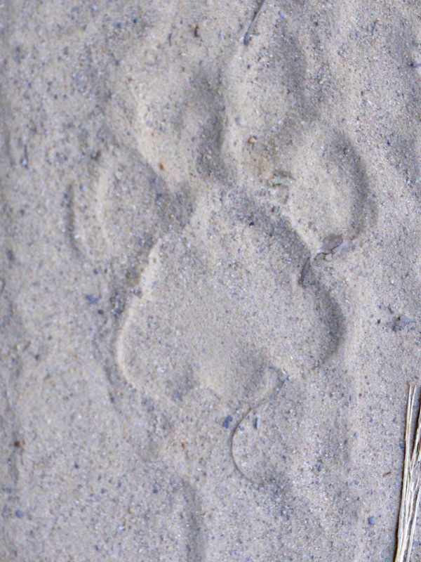 It wasn’t long until we found fresh tracks. Unlike dog tracks, cat tracks have a leading toe, one toe out in front of the rest, and an M on the posterior side of the foot track. Nothing for size scale in the photo but a grapefruit would easily sit completely inside the boundaries of this track.