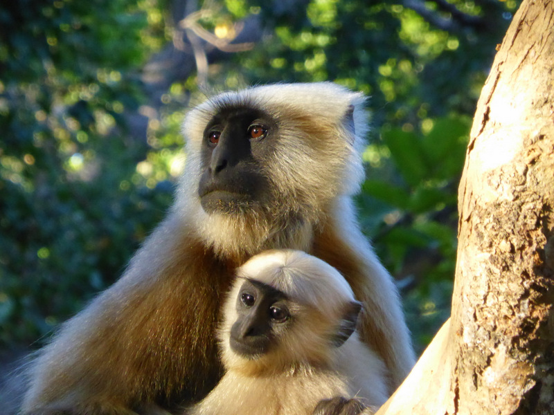 Langurs travel in large troops that often associate with herds of chital. This mama and baby are sitting in a tree just above a foraging group of chital. As we watched the scene, the langurs broke several branches with leaves off of the tree and flung them down for the chital to browse upon. The chital provide the ears and eyes for the langurs on the ground and the langurs have the aerial view, from the trees. The chital have a keen sense of smell, allowing them to detect an approaching tiger long before the langurs might notice the tiger’s movement in the underbrush. But langurs can howl like banshees, when the tiger has been spotted.