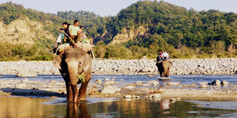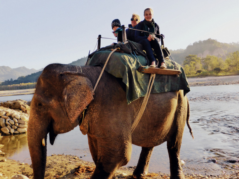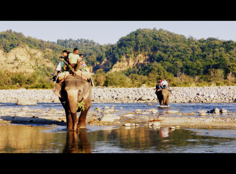 We crossed the Kosi River, the Southern boundary of the park, on elephant back, following the well-worn trail of many other elephant-riders, with an experienced mahout, searching for sign of tiger in the dry river beds.